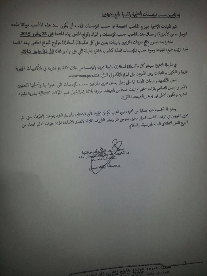 المدكرة الخاصة بتعين خريجي المراكز الجهوية للتربية و التكوين