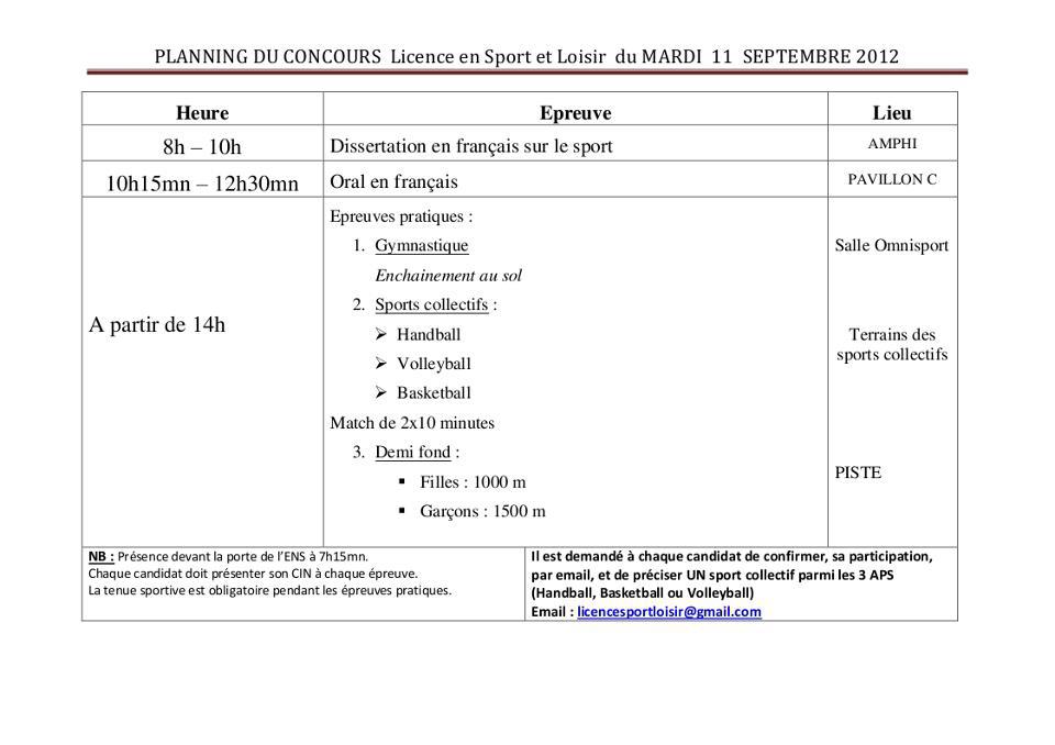 3. PLANNING DES EPREUVES PRATIQUES DU CONCOURS Licence Professionnelle en Sport et Loisir (LSL) SESSION 10 Septembre 2015