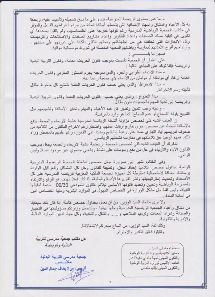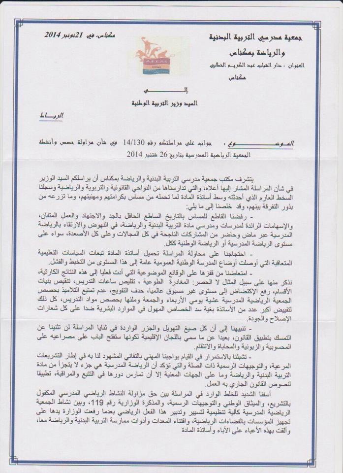 جمعية مدرسي التربية البدنية و الرياضة بمكناس ترد على المدكرة 130/2014في شان مزاولة حصص الجمعية الرياضية