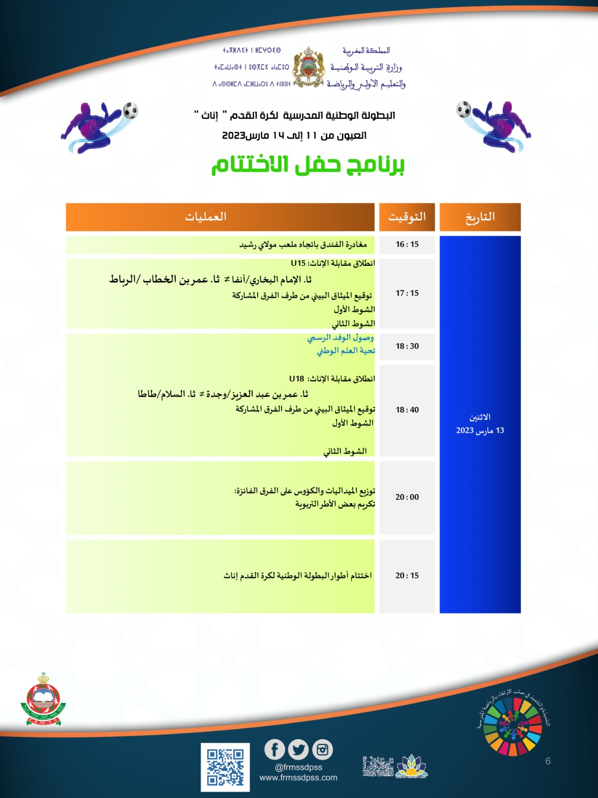 برنامج اختتام فعاليات البطولة الوطنية المدرسية لكرة القدم اناث بمدينة العيون