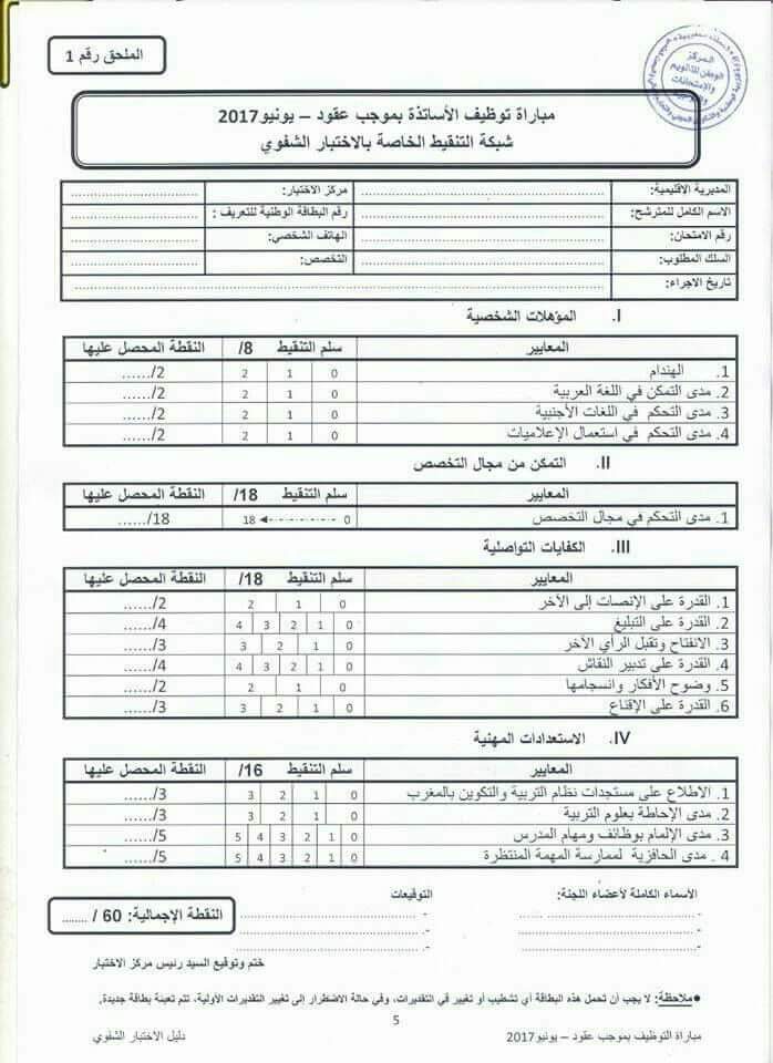 شبكة التنقيط الخاصة بالاختبار الشفوي لمباريات التوظيف بموجب عقود دورة يونيو 2017