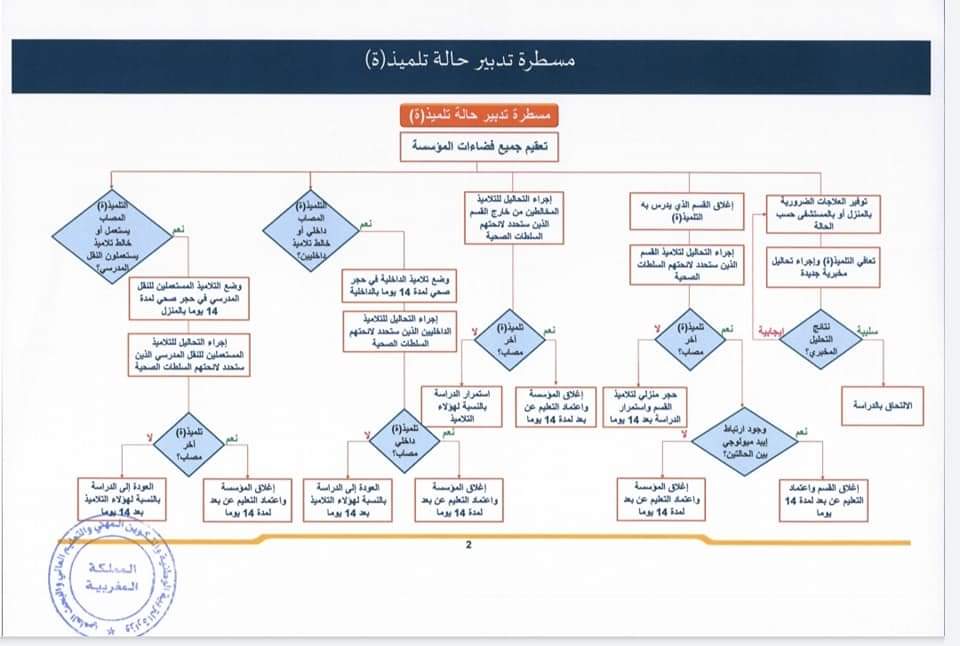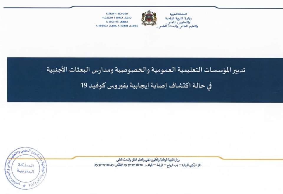 مذكرة رقم 046/20 بتاريخ 15 شتنبر 2020 بشأن مسطرة تدبير حالات الإصابة بفيروس كوفيد-19 بالوسط المدرسي.