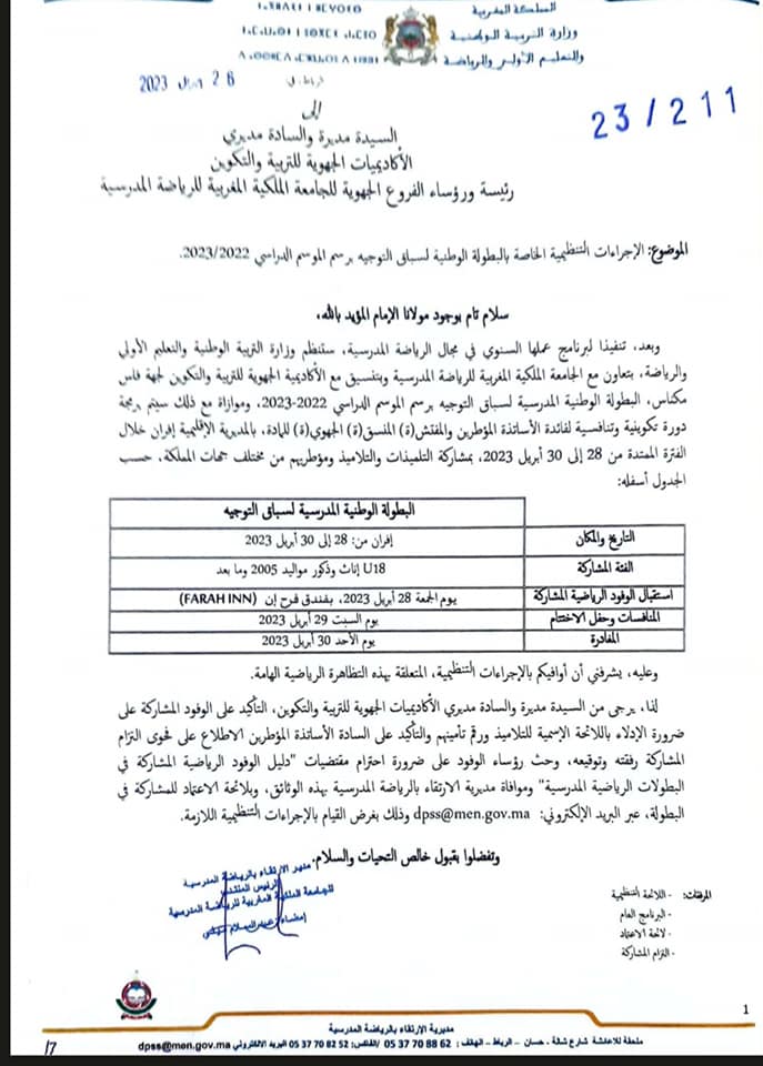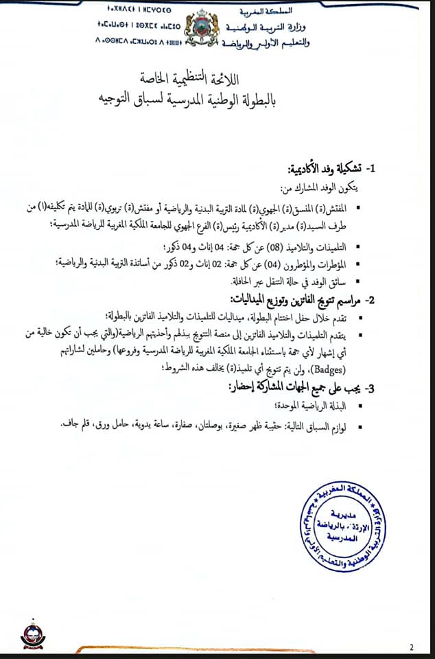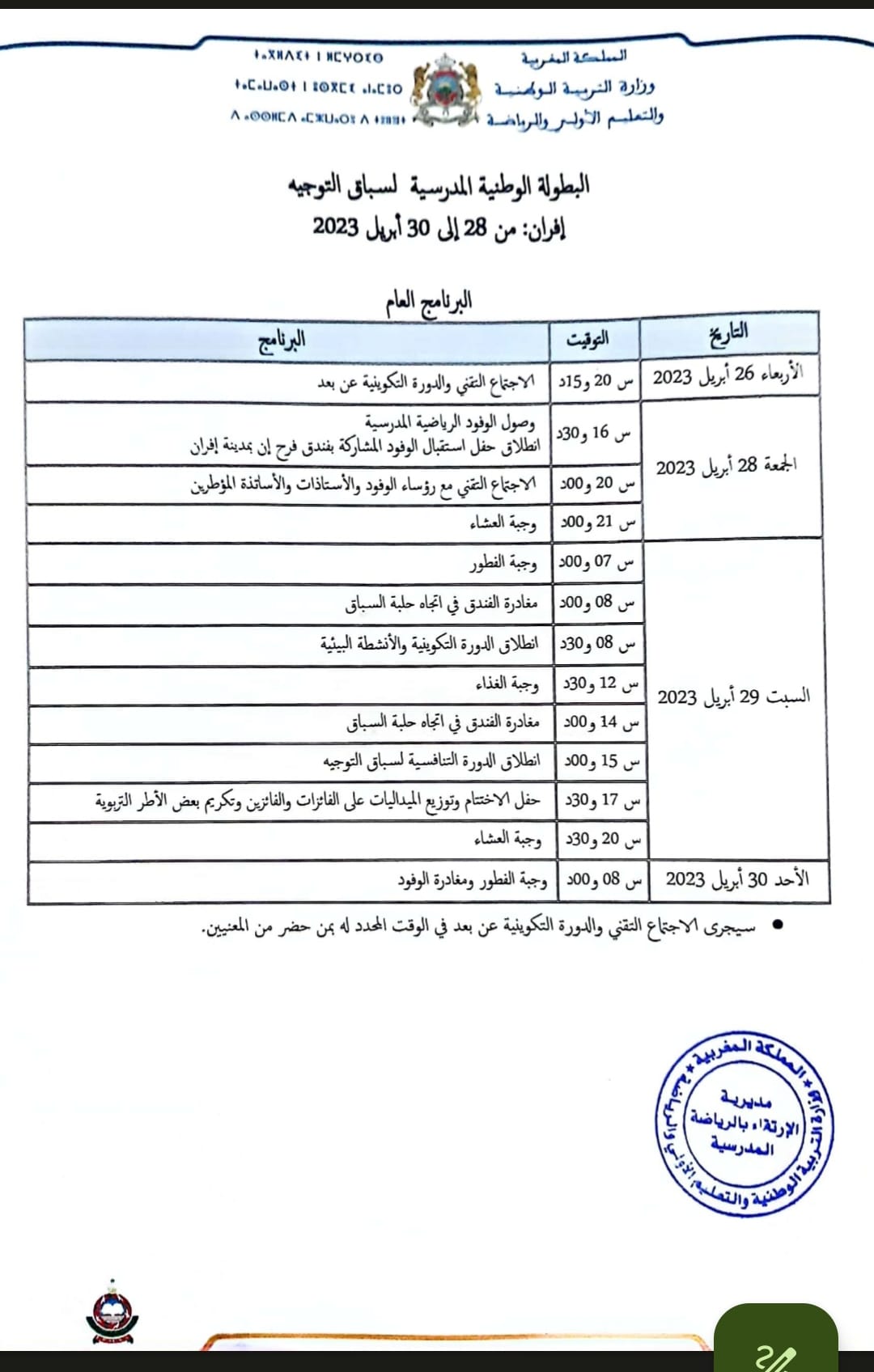 تستعد مدينة افران لاحتضان فعاليات البطولة الوطنية المدرسية لسباق التوجيه للذكور و الانا ث، المنظمة تحت شعار “التلميذة والتلميذ في صلب الارتقاء بالرياضة المدرسية” مع الاجراءات التنظيمية للبطولة