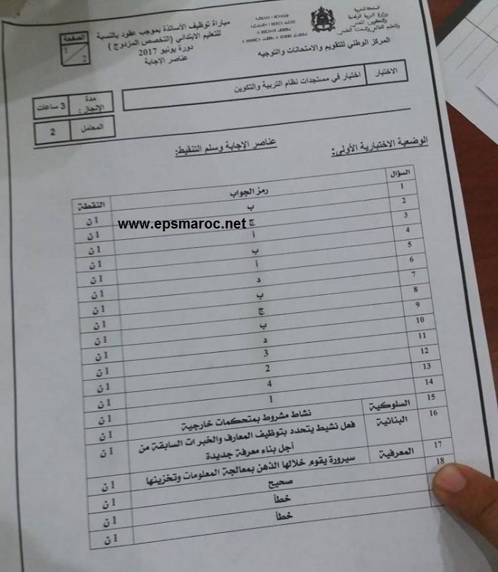 تحميل نماذج الاختبار الكتابي لمباراة التوظيف بالتعاقد في التعليم لسنة 2017 الخاصة بسلك الابتدائي مواضيع الامتحان مرفقة بالتصحبح الرسمي لمباراة التوظيف بالتعاقد
