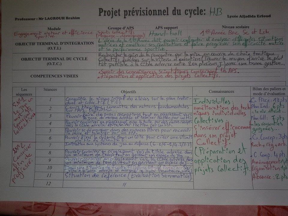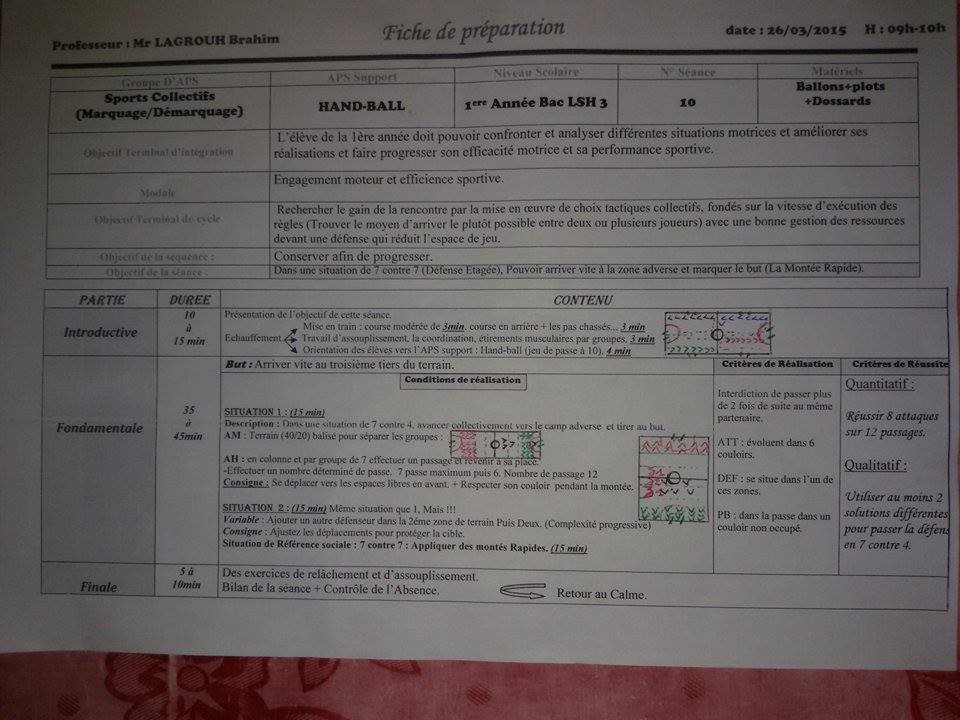 une séance type et un projet de 12 séances de hand ball selon les orientations pédagogique pour les 1ére bac