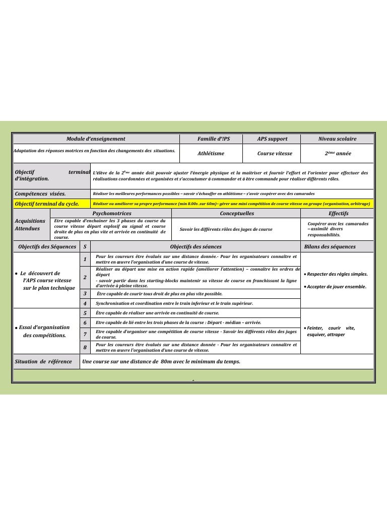 Projet prévisionnel du cycle de 10 séances de la course de vitesse selon les orientations pédagogique 2009