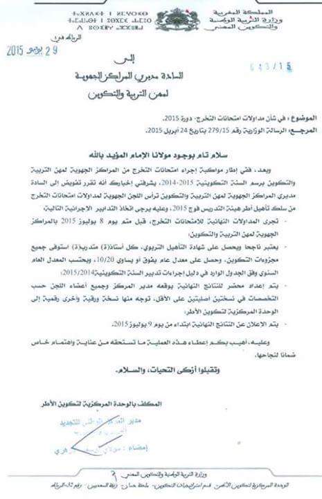 المدكرة الخاصة بمداولات امتحانات التخرج من المراكز الجهوية للتربية و التكوين دورة 2015
