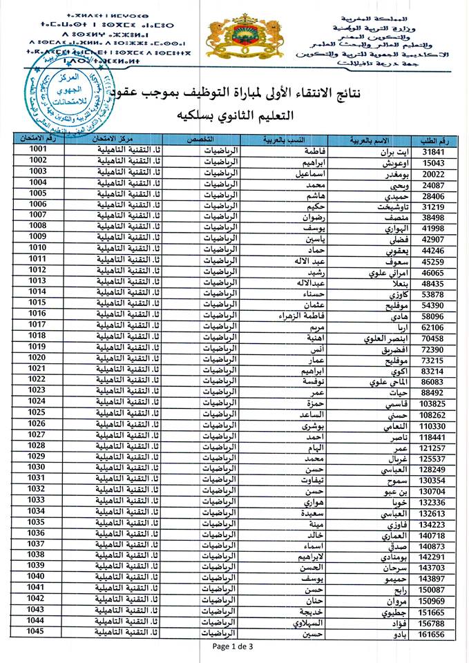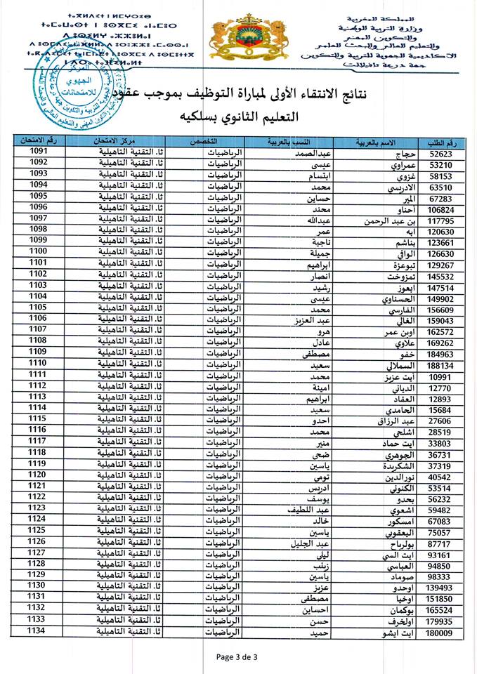 نتائج الانتقاء الأولي لاجتياز مباراة توظيف الأساتذة بموجب عقود بالأكاديمية الجهوية للتربية والتكوين لجهة طنجة تطوان الحسيمة حسب السلك والمواد: