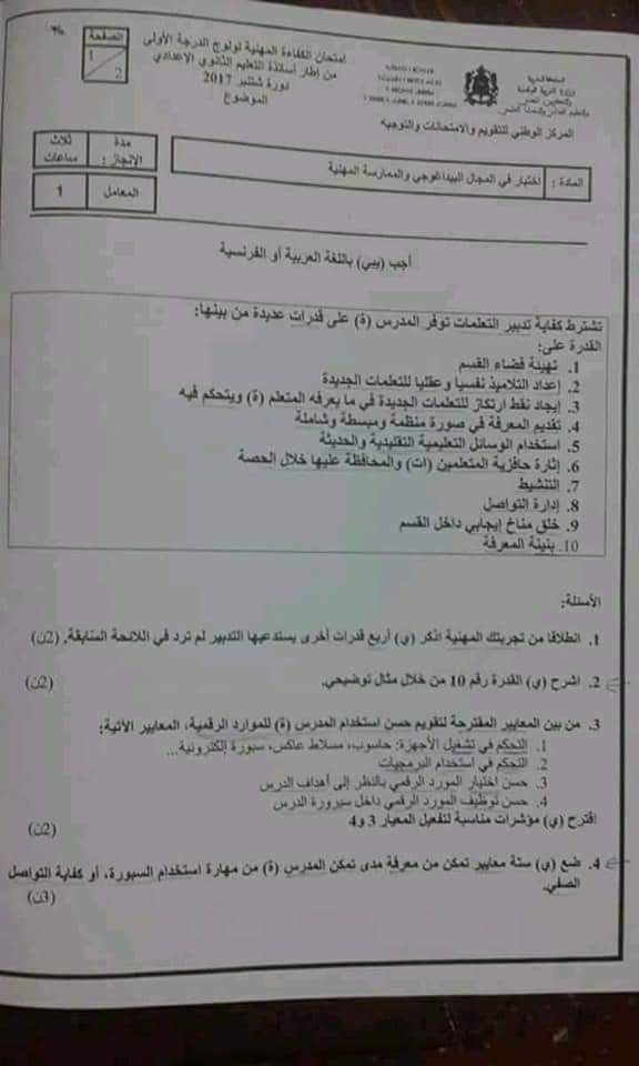 امتحان المجال البداغوجي والممارسات المهنية 2017 اعدادي لولوج الدرجة الاولى