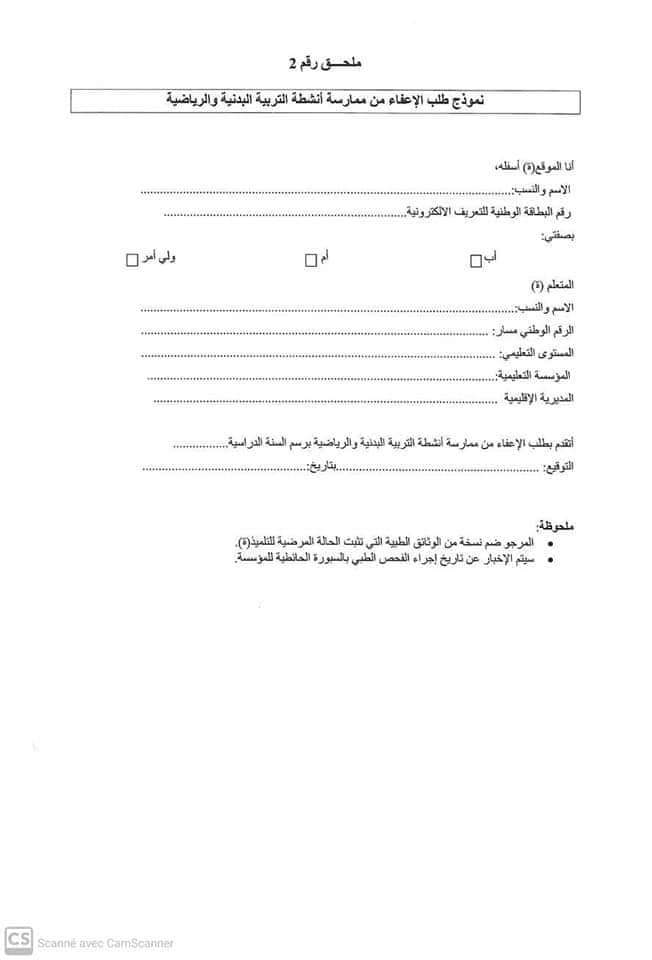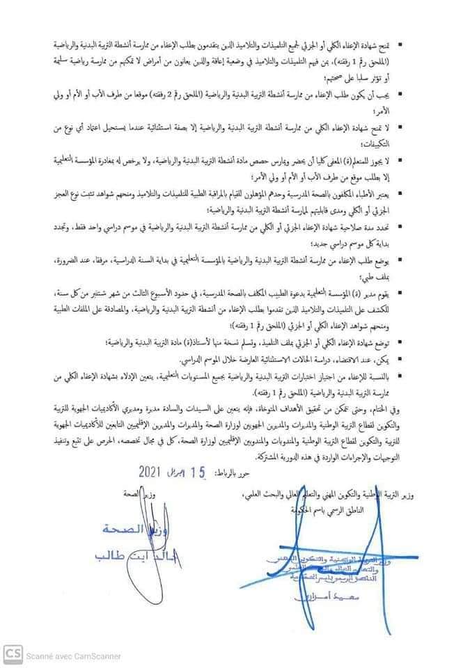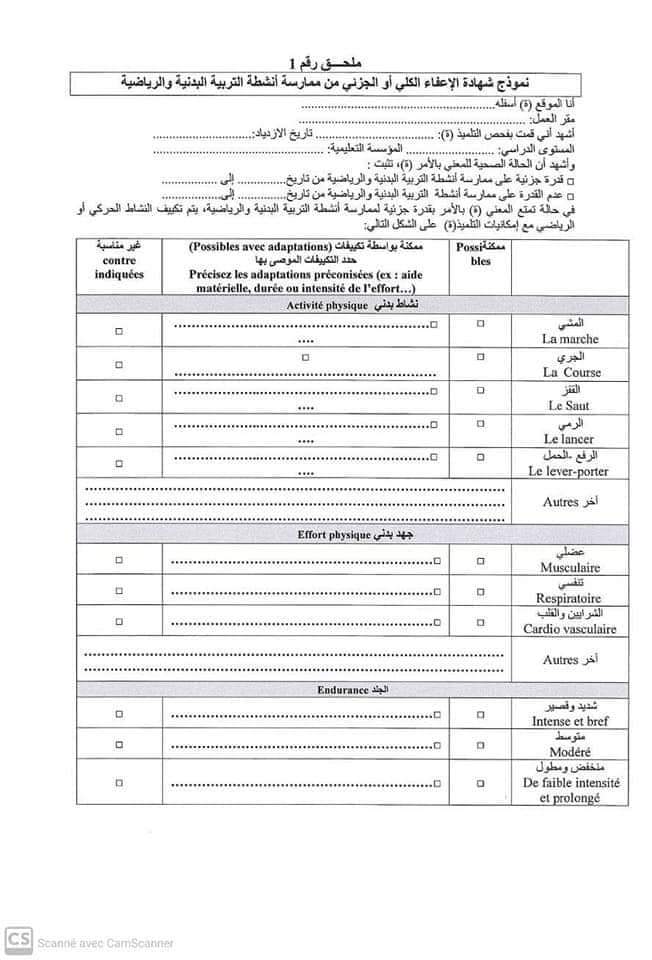 Exll دورية مشتركة 21- 036. 29-19 بين وزير التربية الوطنية ووزير الصحة في شأن منح شهادة الإعفاء الكلي أو الجزئي من ممارسة أنشطة التربية البدنية والرياضة