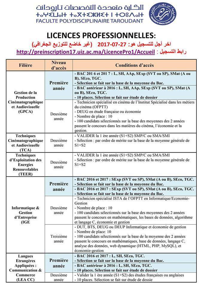 1. افتراضي كلية متعددة التخصصات بتارودانت اعلان فتح باب الترشيح لولوج 5 اجازات المهنية للحاصلين على شهادة الباكالوريا او دبلوم الدراسات الجامعية العامة