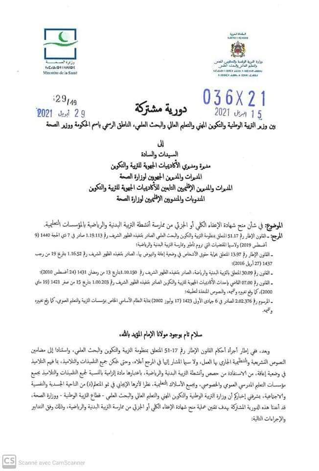 دورية مشتركة في شأن منح شهادة الاعفاء الكلي او الجزئي من ممارسة التربية البدنية والرياضة بالمؤسسات التعليمية.