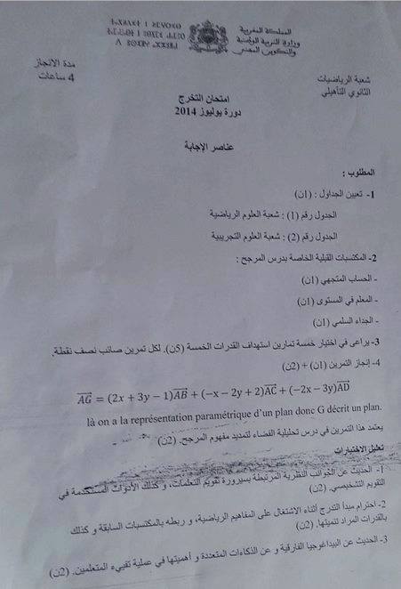 عناصر الاجابة لامتحان التخرج من المراكز الجهوية للتربية والتكوين دورة يوليوز 2014 مادة الرياضيات الثانوي التأهيلي