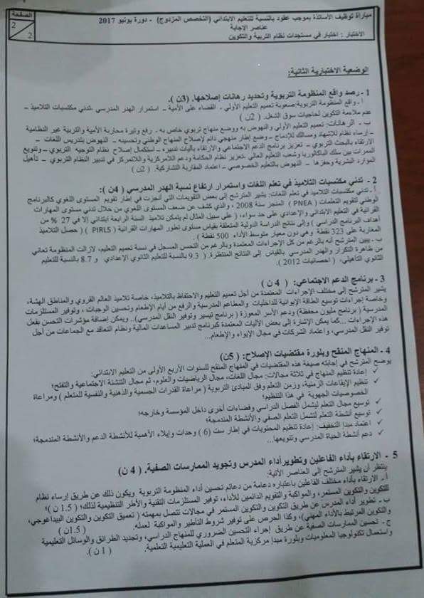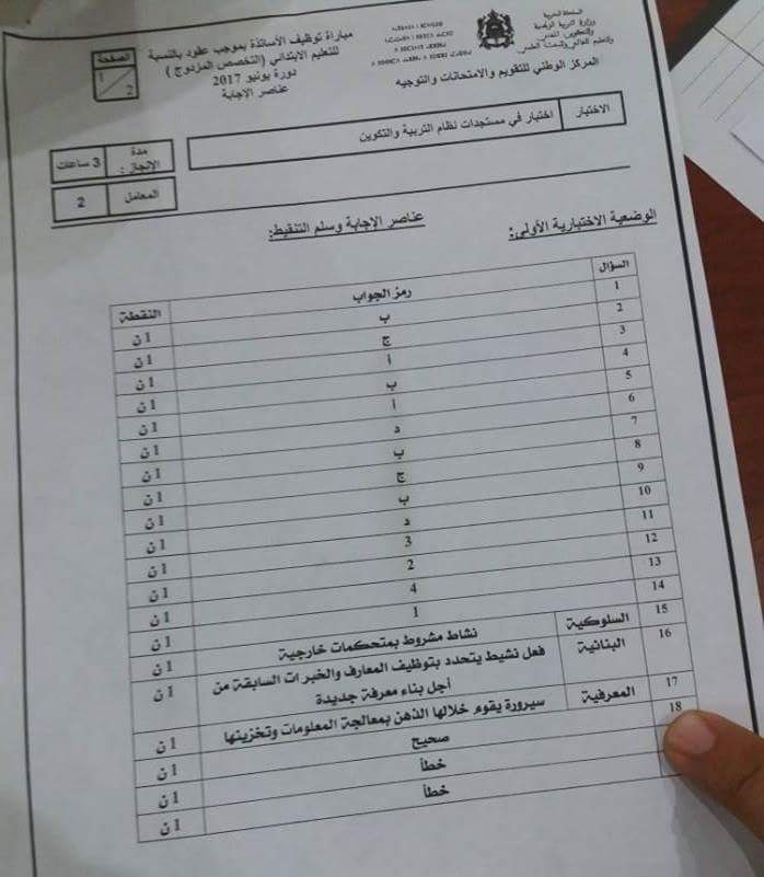 عناصر الاجابة لمباراة التوظيف بموجب عقود يونيو 2017 / السلك الابتدائي اختبار مادة مستجدات نظام التربية والتكوين