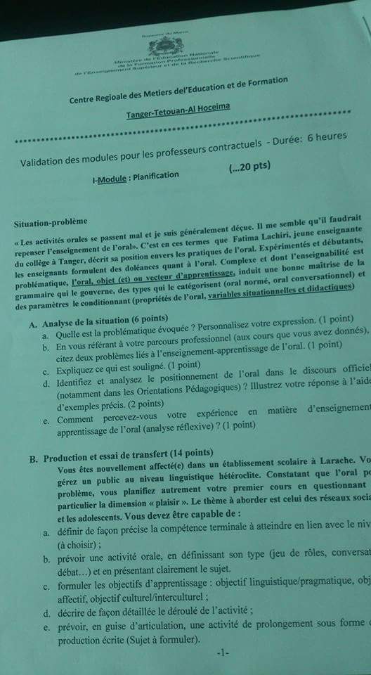 اللغة الفرنسية جهة طنجة تطوان الحسيمة الاختبارات الكتابية الخاصة بالتصديق على استيفاء مجزوءات التكوين الحضوري لفائدة الأساتذة الموظفين بموجب عقود فوج 2016