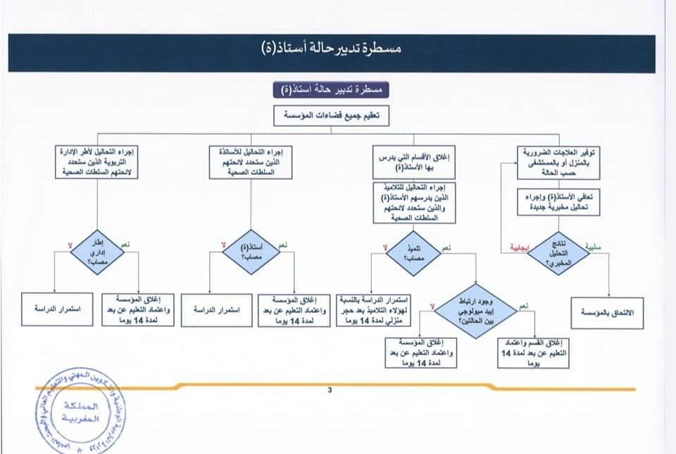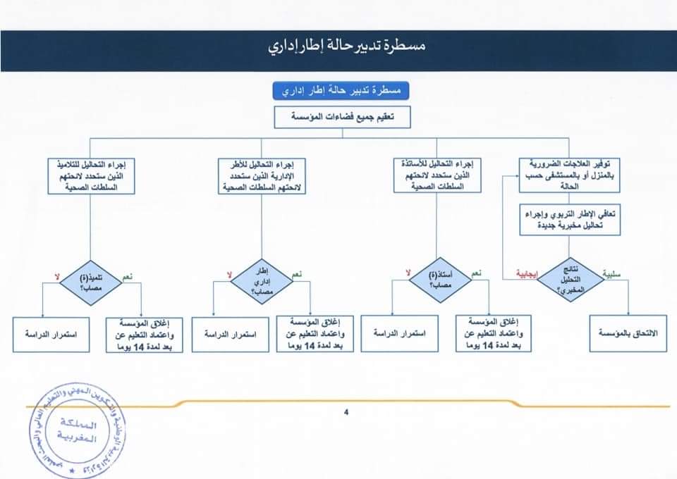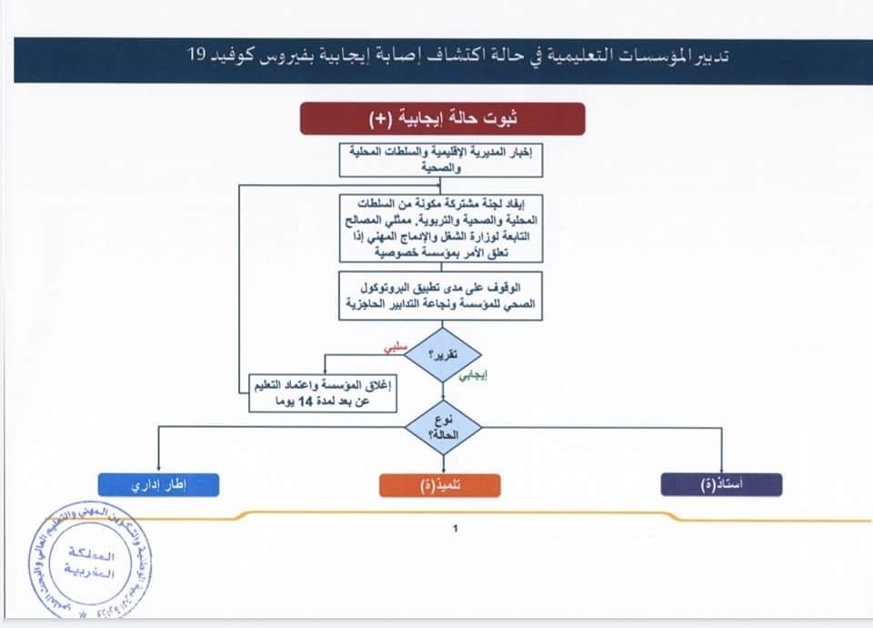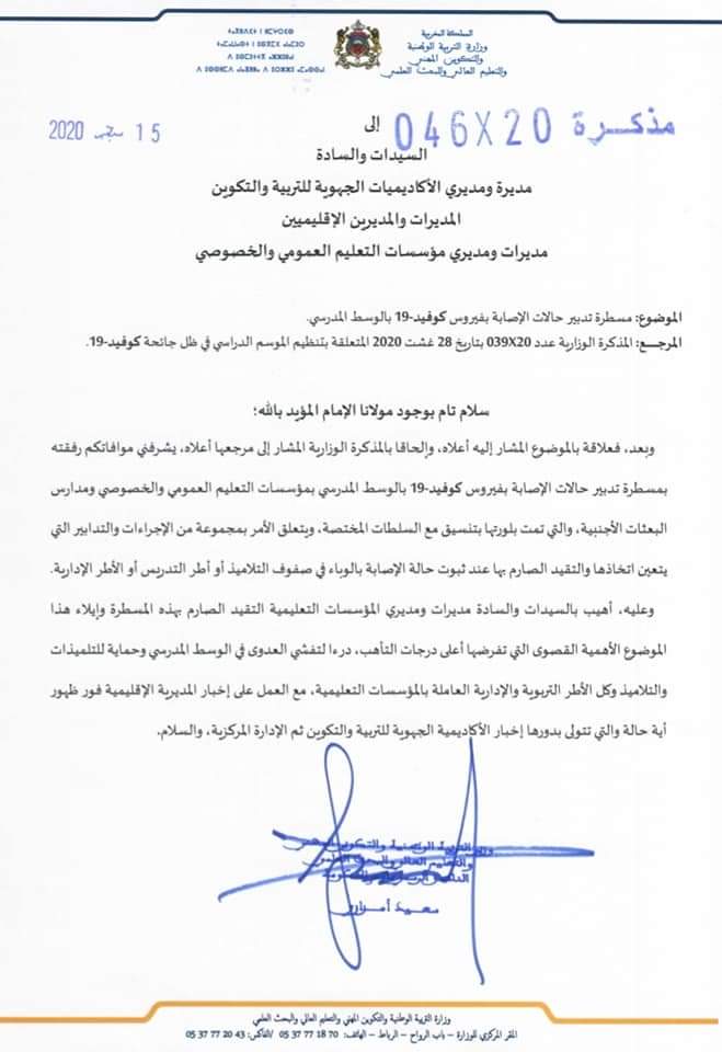 مذكرة رقم 046/20 بتاريخ 15 شتنبر 2020 بشأن مسطرة تدبير حالات الإصابة بفيروس كوفيد-19 بالوسط المدرسي.